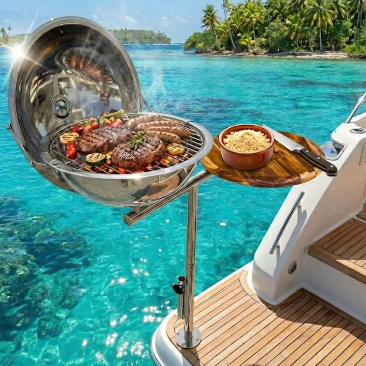 Eleve sua experiência a bordo com a versátil Estação Gourmet PGM-314-G da Overboat. Este kit foi brilhantemente projetado para centralizar tudo o que você precisa para um dia perfeito na água: uma churrasqueira a carvão de alta qualidade, uma prática tábua de corte e um suporte dedicado para o seu guarda-sol. Fabricado em Aço Inox 304 com acabamento de alto brilho, este sistema não só organiza seu espaço de lazer, mas também adiciona um toque de sofisticação e engenharia inteligente à sua embarcação. Prepare seu churrasco, sirva seus convidados e relaxe na sombra, tudo com um único e elegante equipamento.