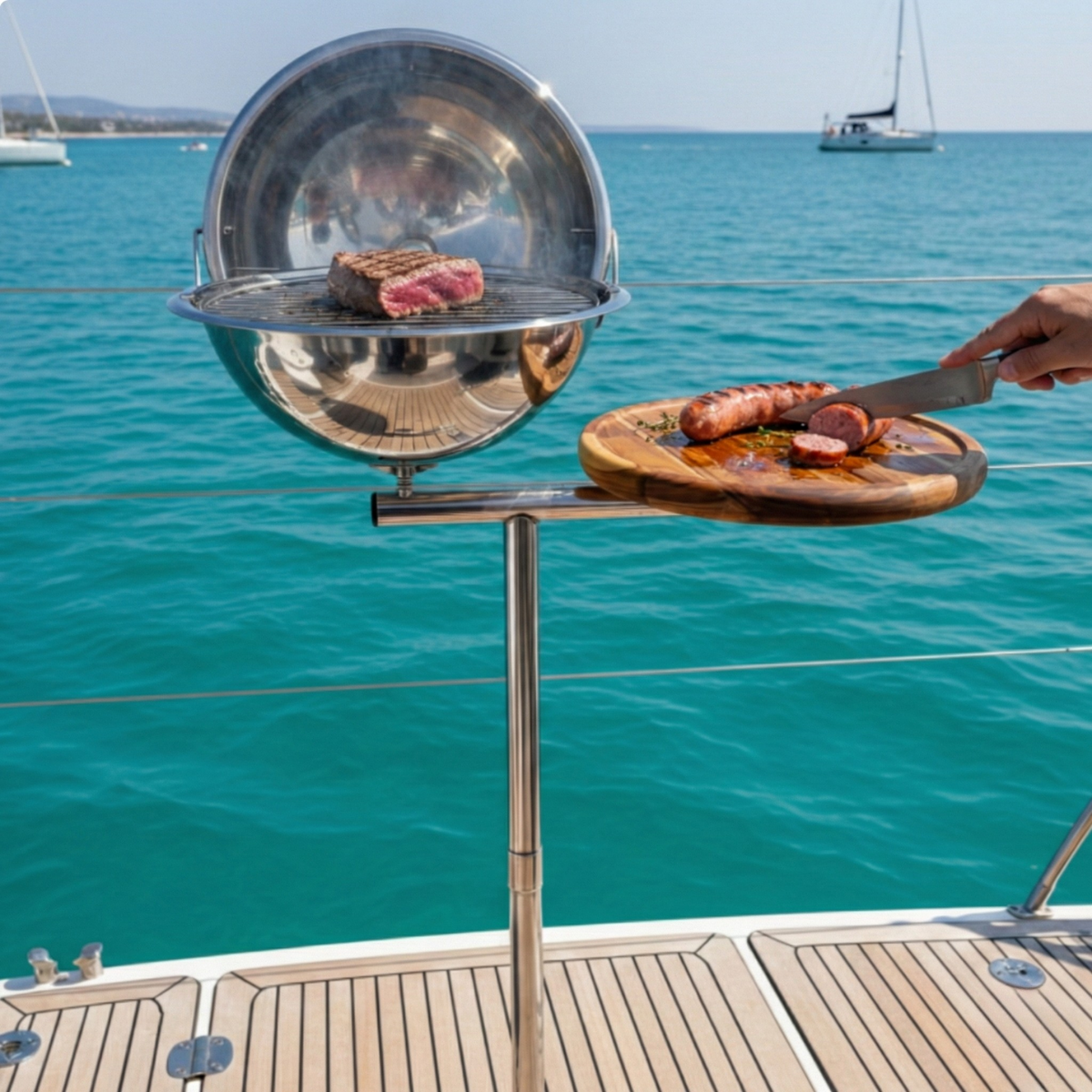 Desfrute de toda a praticidade e sofisticação de uma estação gourmet completa com o Kit de Churrasqueira PT-314 da Overboat. Este conjunto foi pensado para oferecer a experiência de churrasco a bordo mais completa e funcional. Ele une nossa clássica churrasqueira redonda de 38cm, um robusto pedestal bipartido para fácil armazenamento e uma prática mesa de apoio para o preparo dos alimentos. Fabricado em Aço Inox AISI 304 com polimento em alto brilho, este kit é a solução definitiva para quem busca qualidade, durabilidade e momentos inesquecíveis na água.